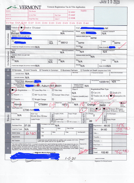 This post shares in detail my experience in going through the process to register a Honda CT90 in the state of Vermont and then take that registration and use it to get a title here in the state of Washington. I'll explain the process and then share actual copies of the my completed application and what I received back from the Vermont DMV.I have purchased a number of CT90's that didn't have a title and with the ones that I planned on keeping, I have gone through the "Ownership in Doubt" process here in Washington State that enables you to register and license the bike so you can take it on the road, but there is a long delay in being able to obtain a title. While the process works, it isn't cheap, and you have to go through a three year waiting period before being able to apply for an official title. The three years is supposedly to allow time for a previous owner to come out of the woodwork and claim the bike.