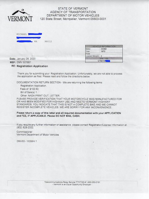 My cover letter had left the impression that the bike I was trying to register "may" not have been a road worthy bike due to me sharing that when I purchased the bike it was a "parts bike". The Vermont DMV was nice and didn't outright reject my application, but just asked me to verify that the bike meets all Vermont highway standards, which I was happy to do.