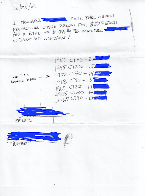 I also include a copy of the Bill of Sale shown below. I purchased seven parts bikes (these bikes were a great deal!) with this bill of sale so I marked it up to show the specific bike I was trying to register.