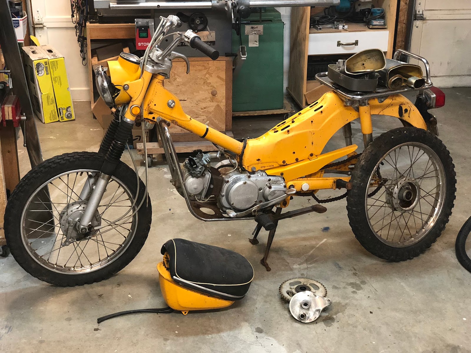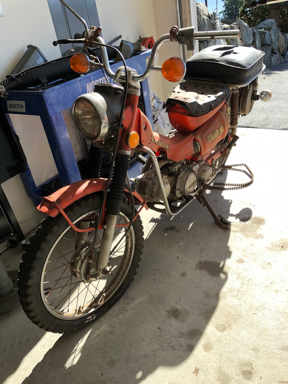 Here is another purchase, its a 1969 CT90 that I picked up for $75.00. The kid I purchased it from said that it had been running a year ago and the had it set up to run directly off the magneto/alternator which I questioned, but the bike does have good compression and kicks over nicely. Another fun project.
