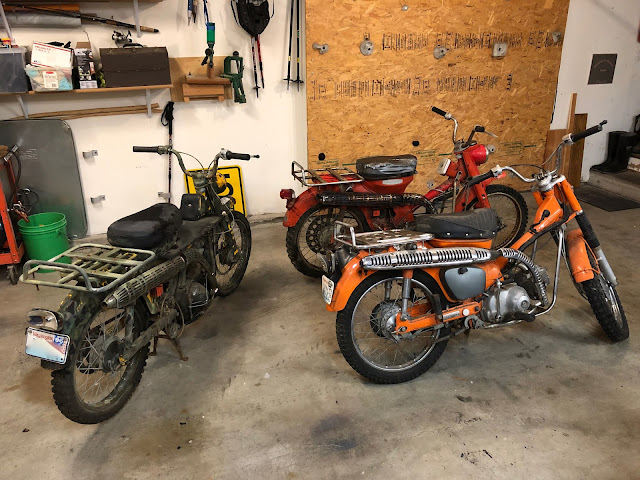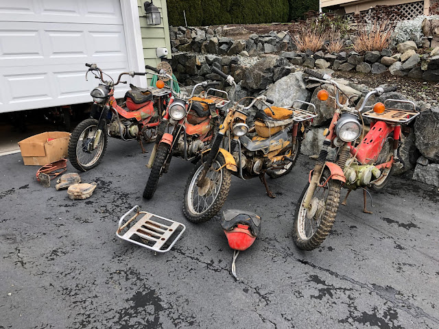 I was on the Honda Trail CT90 - CT110 Taptalk Forum recently (January 2020) on and someone posted that they had three CT90's and one CT110 part bikes they wanted to go to a good home and was only asking $100.00 for all four bikes. I sent the individual a message, and was able to get the bikes which also included a box of parts and they only cost $100.00 (no titles though...) and a tank of gas as the individual was 180 miles from my home. It was worth the drive and the picture below is of the bikes and parts I picked up.