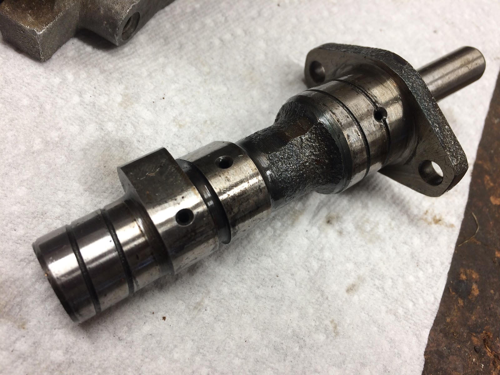 If you do tear into your CT90's engine to replace a piston or do other work it is always a good idea to take a little more time and make sure any and all oil passages are clean and clear before reassembling the motor. An example would be a part like the overhead cam where each of the cam lobes and bearing journals have a hole where oil is provided to the surface while the engine is running. Oil gets to each of these holes from a bore that starts at the left end of the cam shaft in the picture below and runs to just underneath the hole that is visible in the right most bearing journal. When you have a part like this out of the engine you really need to make sure that there is no dried up crud in the bore or in one of the oil supply holes and you should be able to look down the bore and see light coming through each of the oil supply holes.