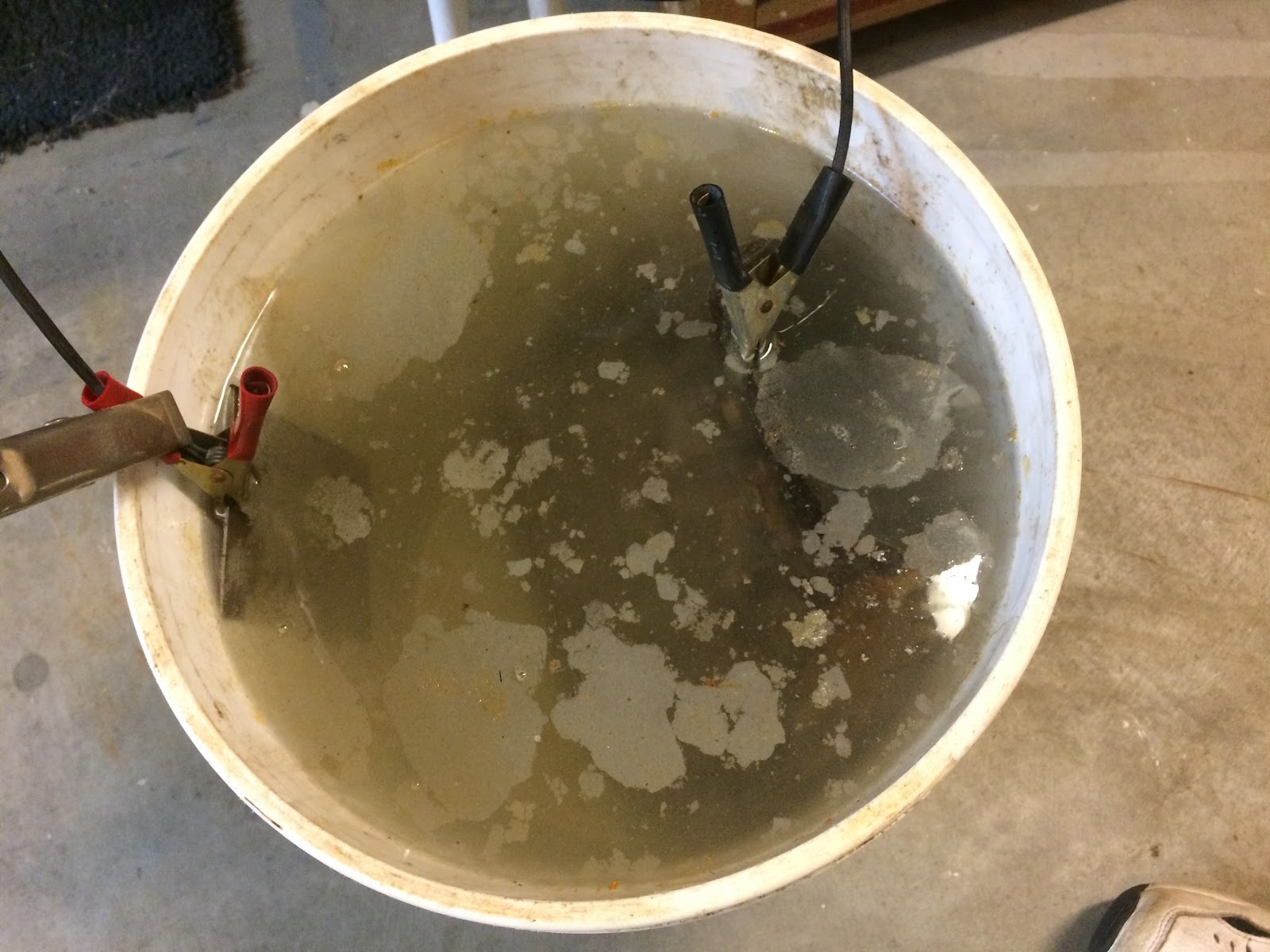You'll want to do the process outside or in a well ventilated area as it does produce gases as part of the normal process. Whenever you are hooking up the battery charger to your part or the anode in the bucket first make sure to unplug your battery charger.