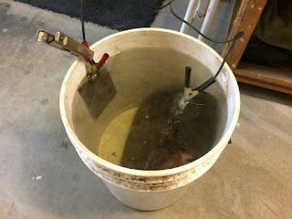 Here is the bucket of solution and the electrodes attached to the anode and the seat pan.