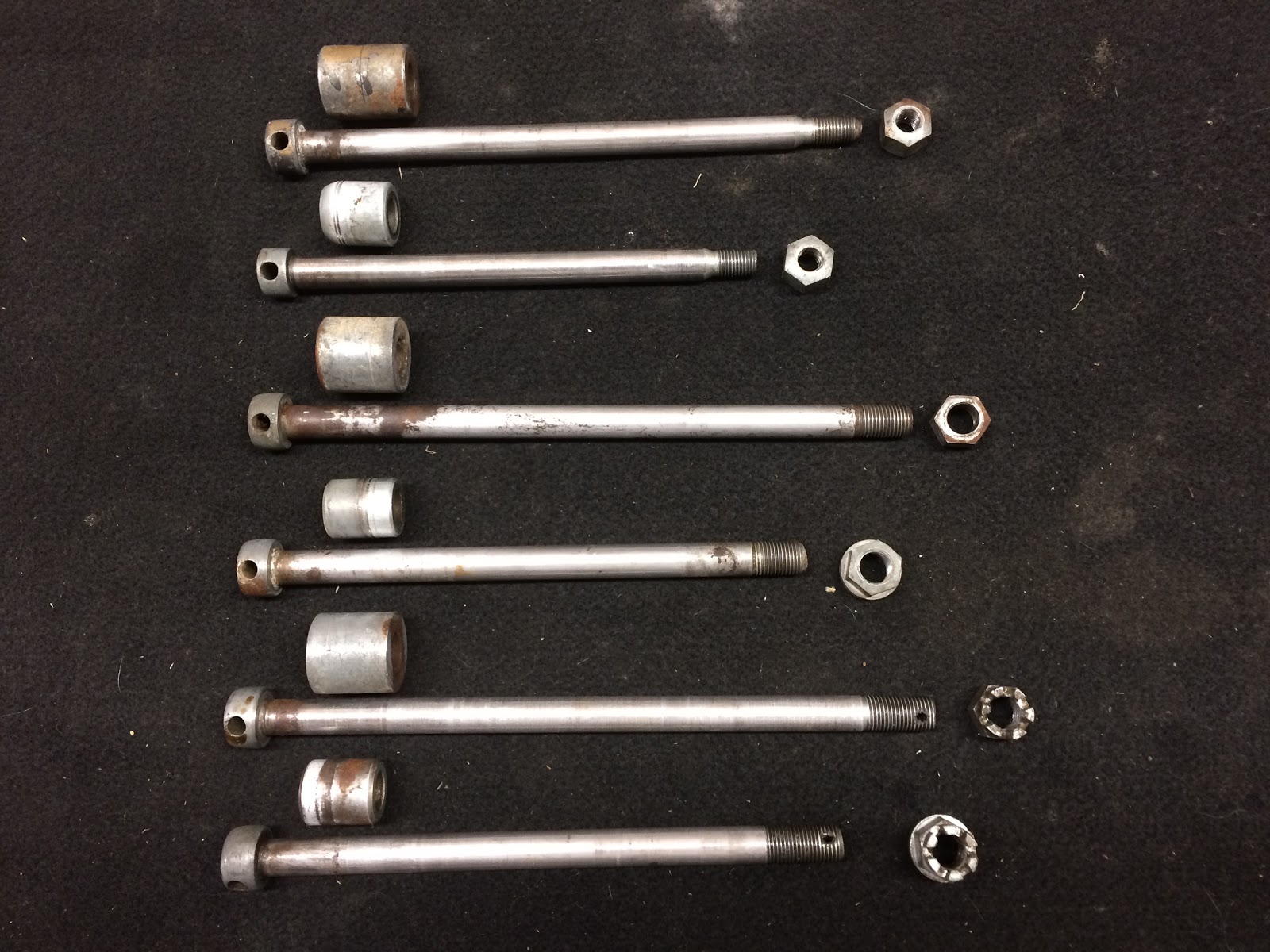 Here is a picture of the three groups of axles with the CT200 axles at the top of the photo, the K0 to K1 in the middle, and the K2 and on on the bottom. The rear axle is the top axle in each group and I have also included the correct spacer/collar and nut used on each axle.