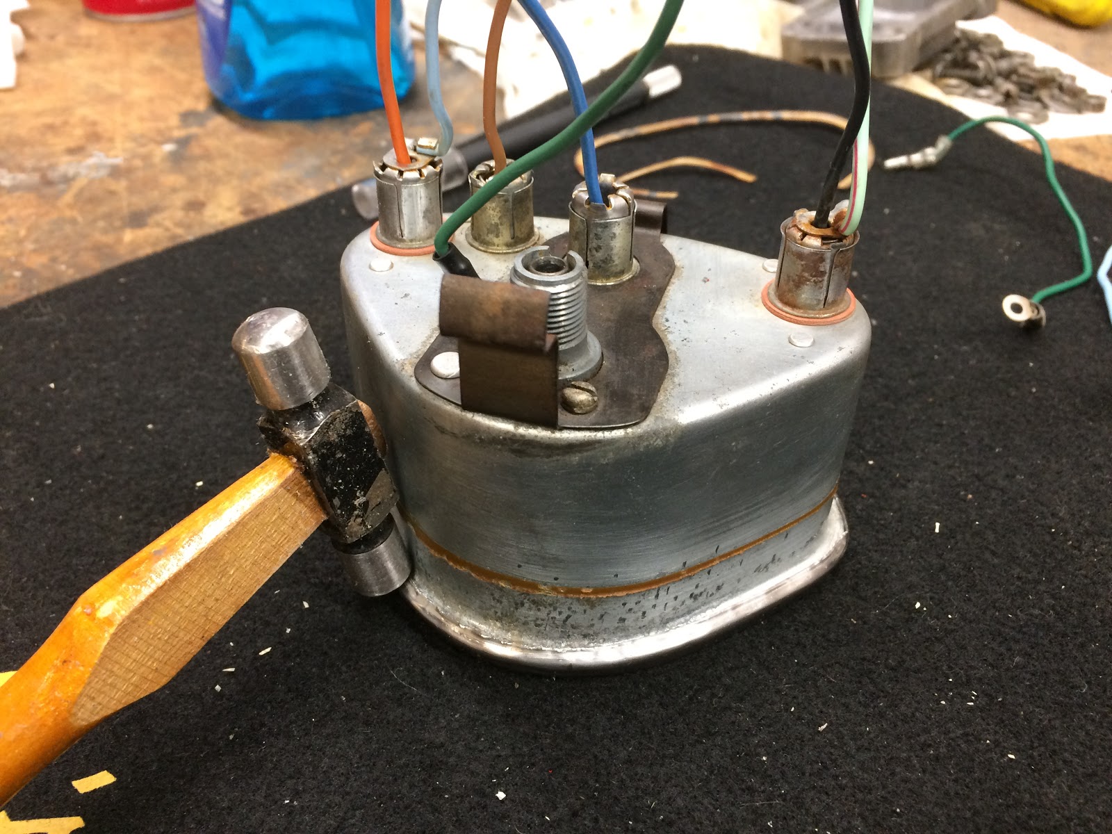To reassemble the speedo you insert the speedo back into the housing and secure with the two screws you removed earlier making sure to install the ground wire under the appropriate screw. Next you would put the rubber gasket around you're front glass and then insert that down into the trim ring and then assemble the plate over the glass and then lastly take the speedo housing and insert it down into the trim ring. The last step is to roll the edge of the trim ring back over so that it hold everything together. For this speedo I used a very small hammer that I have and tapped around the rim which worked well at getting the trim ring secure, but the vibration from the hammer broke loose debris in the housing which collected on the inside of the glass (in my case plastic). Also, ctbale used a pair of modified pliers to roll over the trim ring and is what I might try on the next speedo and I would recommend to anyone planning to do this rebuild.