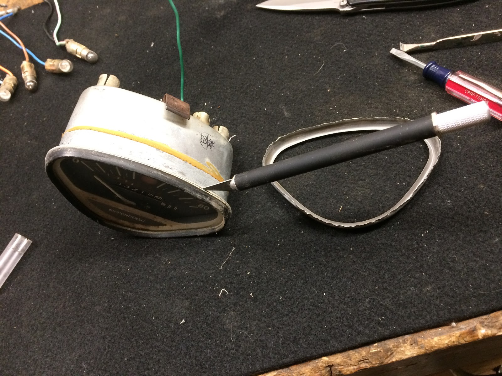 After first removing the light bulb sockets from where they are installed on the bottom of the speedo the first real task is to remove the trim ring that holds the glass on the front of the speedo and this involves carefully bending up the lower lip of the trim ring. In looking for the right tool to pry up the lip I found that a cheap paint can opener like you can pick up at Home Depot for a buck works just perfectly.