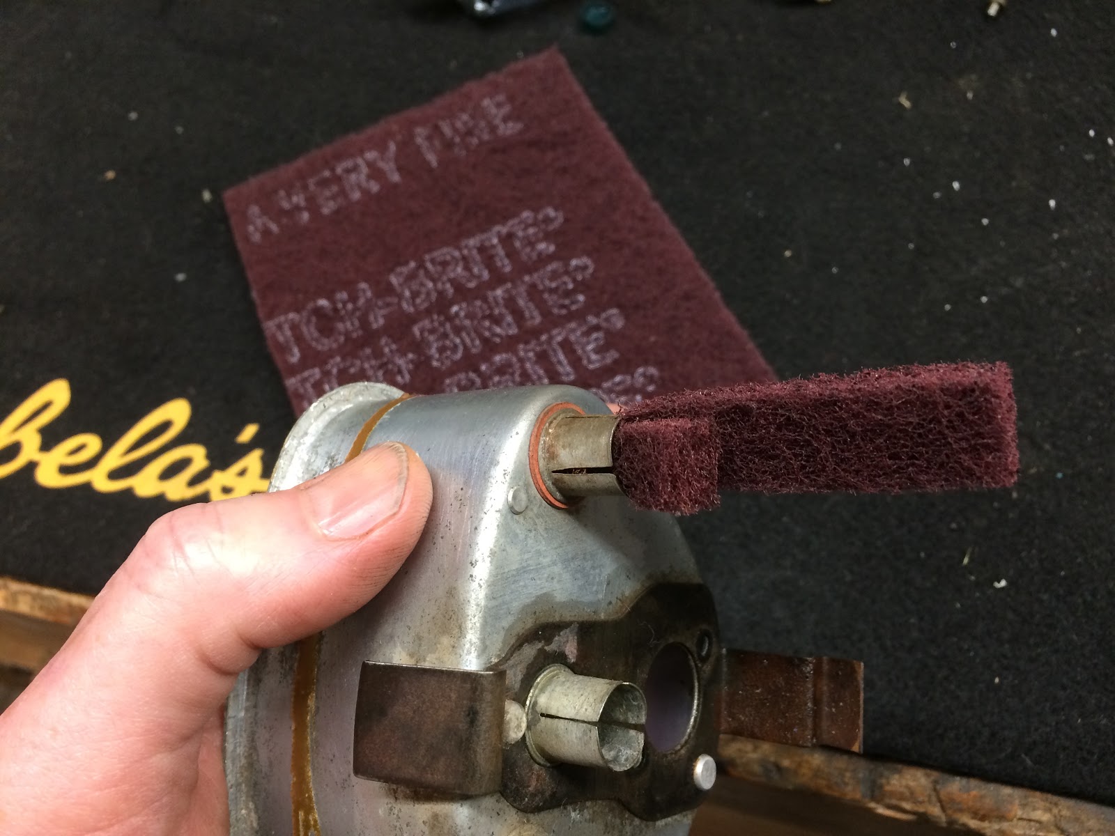 To clean the mating sockets on the bottom of the speedo housing I cut a strip of Scotch Brite folded it in half and then inserted in each of the sockets and twisted it around until the sockets were clean.