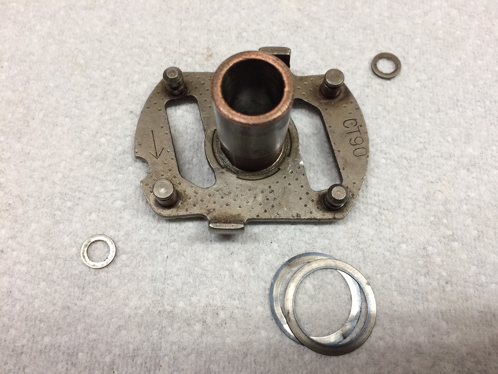 The first step in building up this assembly is to install the .030 thick washers on the two posts that will ultimately receive the advance weights, and also install the two thin washers on the center shaft that the ignition cam will rotate on.