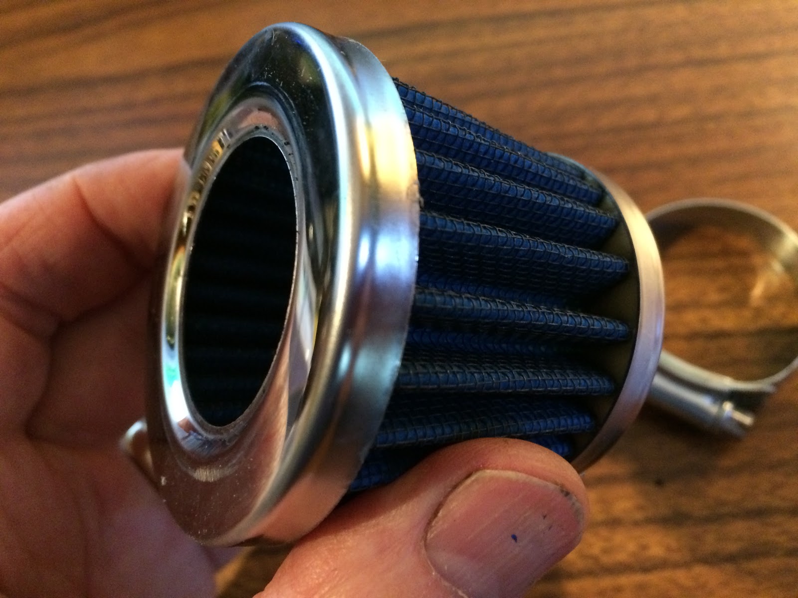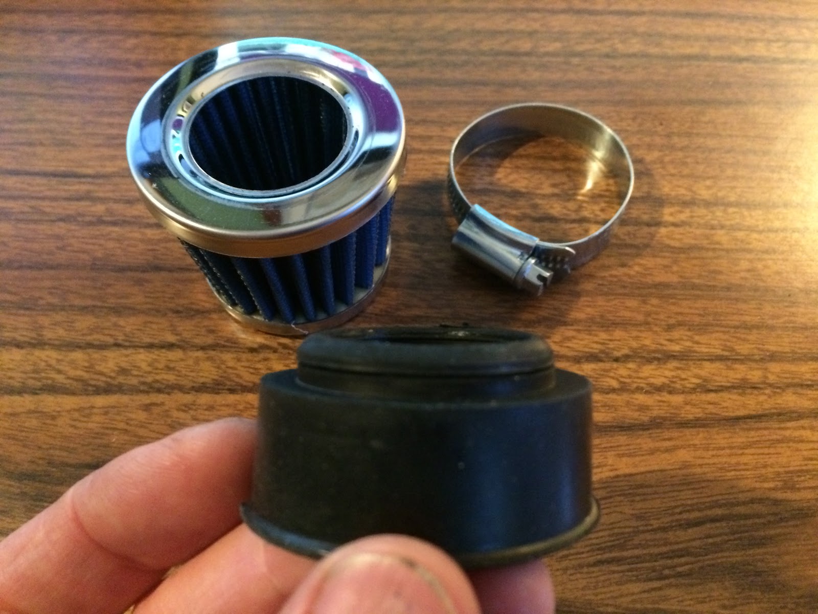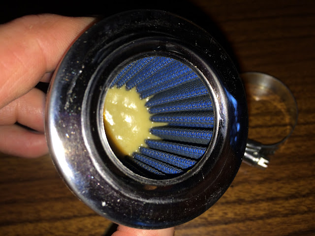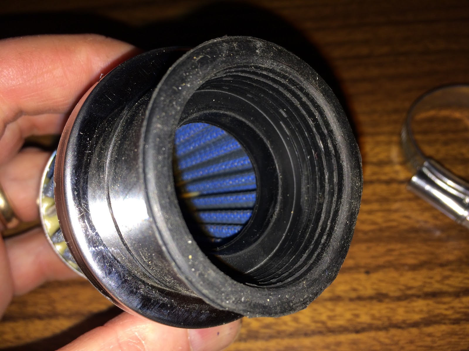 To see what would happen I tightened up the hose clap to see if the filter could be installed on the K3 carb and while I could get it to tighten down so the filter would stay on, it distorted the rubber element and almost was pulling it out of the rear of the filter as shown in the picture below.