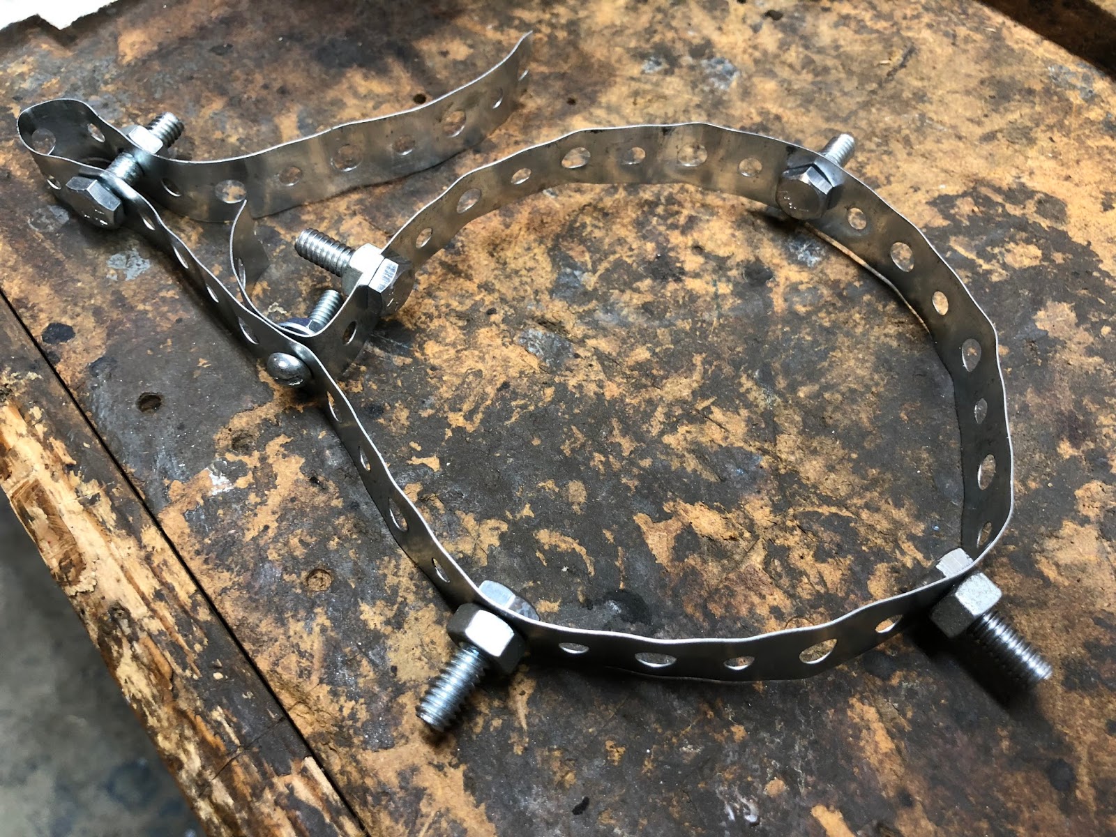 The concept is pretty simple. You take a length of standard plumbers tape like what you can pick up in the plumbing section of your local hardware store and the install several 1/4 inch bolts around the length of the tape that will go around the clutch assembly with the heads facing the outside diameter of the clutch housing. A fifth bolt is used to close off the loop of tape around the clutch assembly and the holes it goes through are selected so that when this bolt is tightened up the loop around the clutch gets snugged up nice and tight. The remaining tail of plumbers tape it then wrapped around the kick-starter shaft and secured with a bolt.