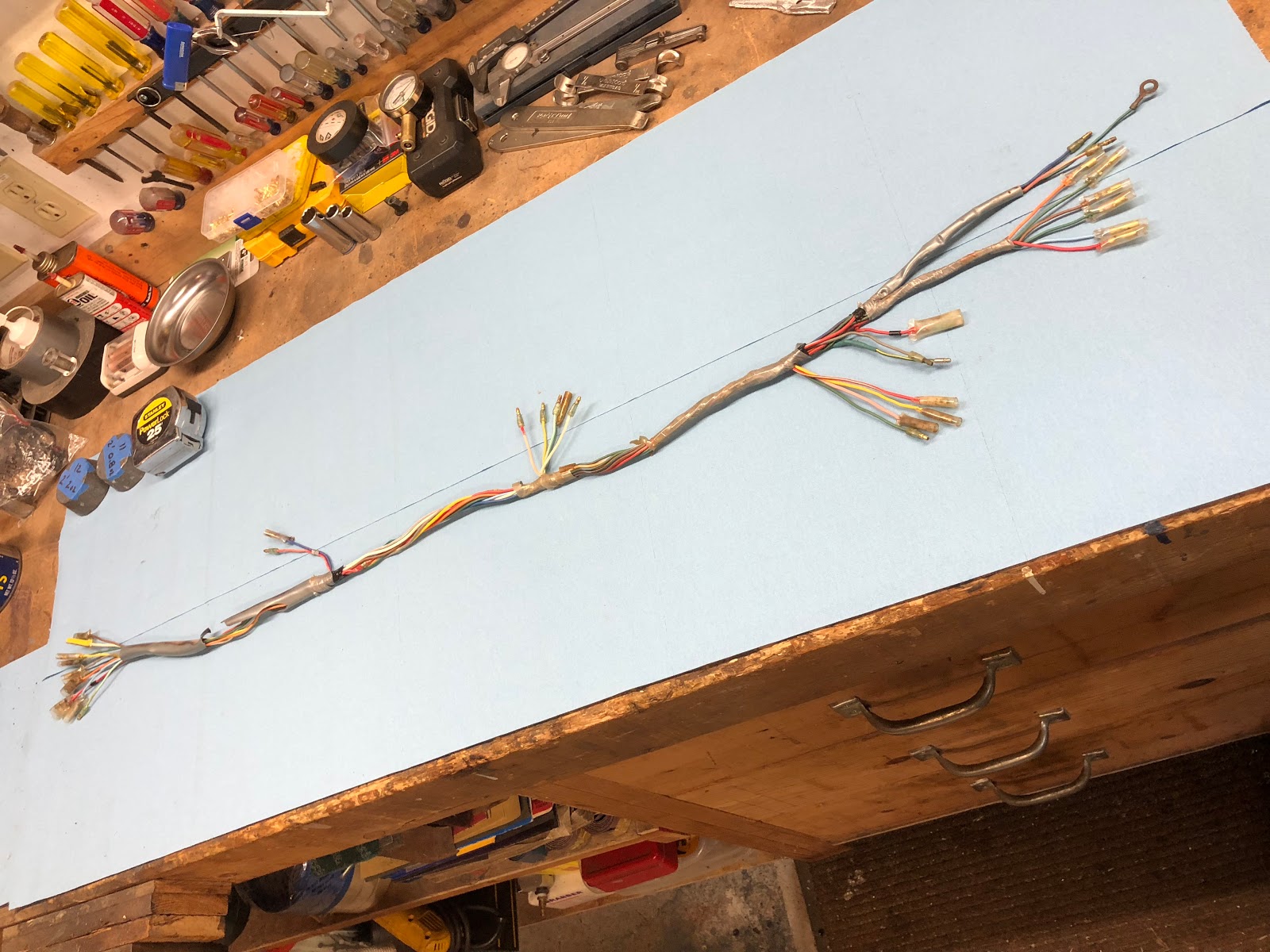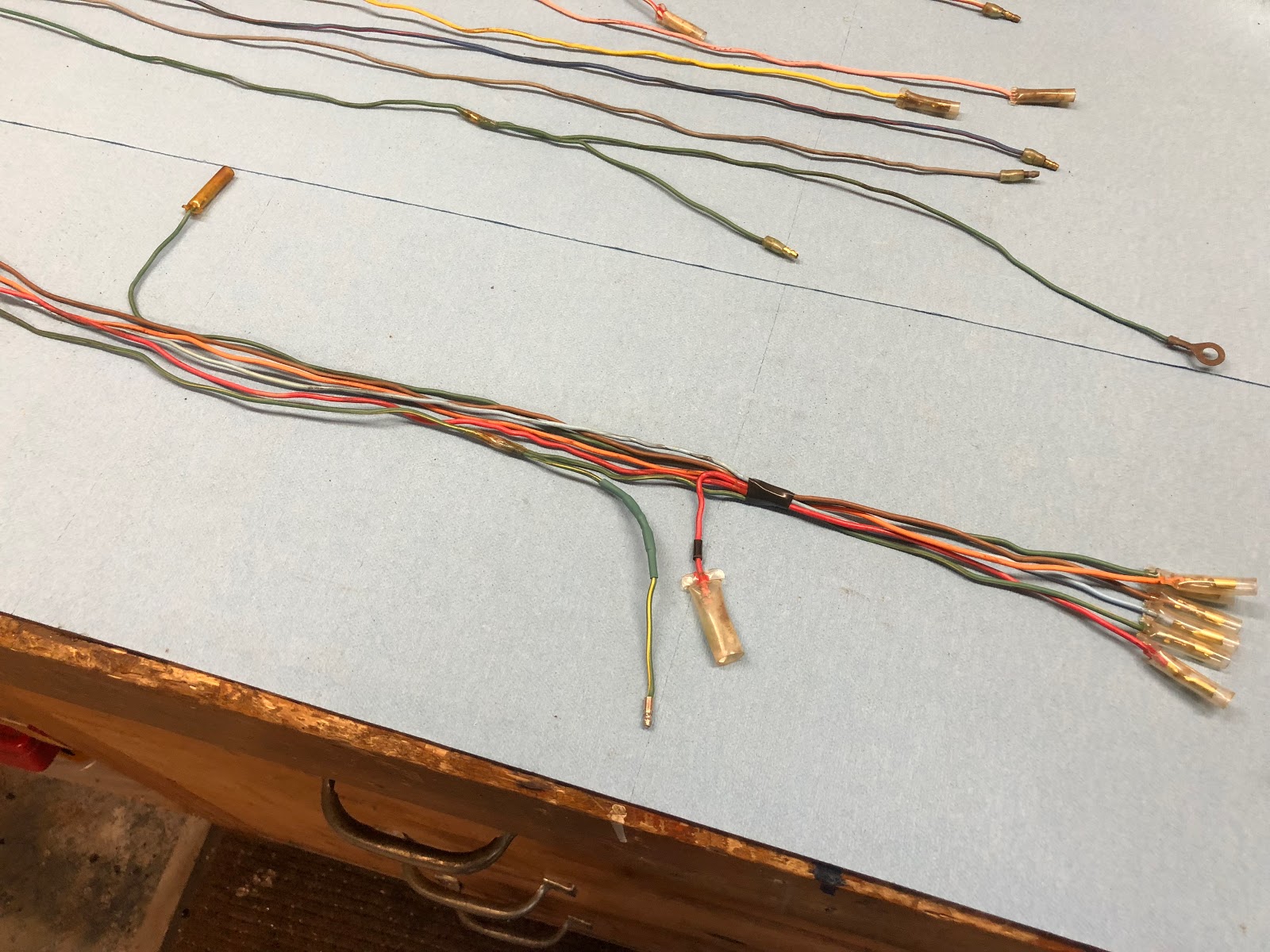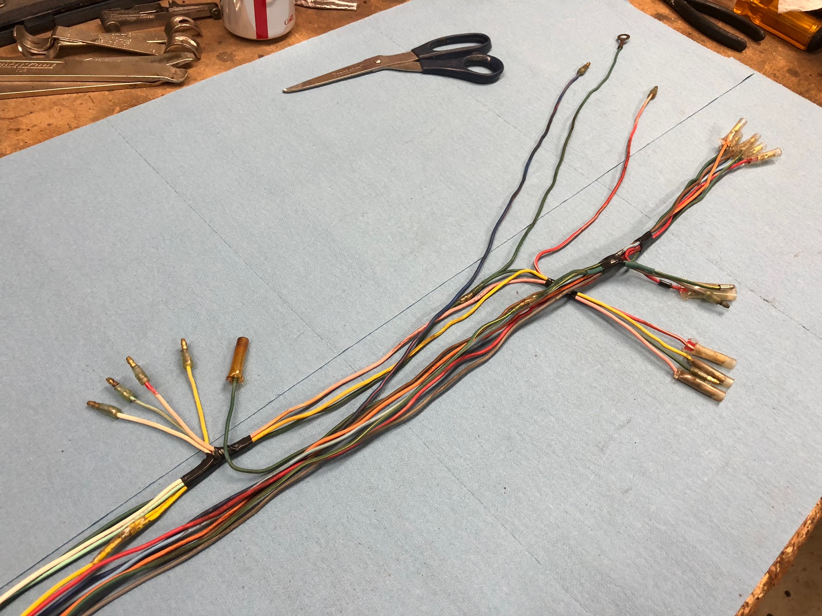 The following series of photos show how I go about taking all the individual wires back into a complete harness. I basically start to group specific wires together and then tape key points and then finally start taping and add sleeving working from the center outward.
