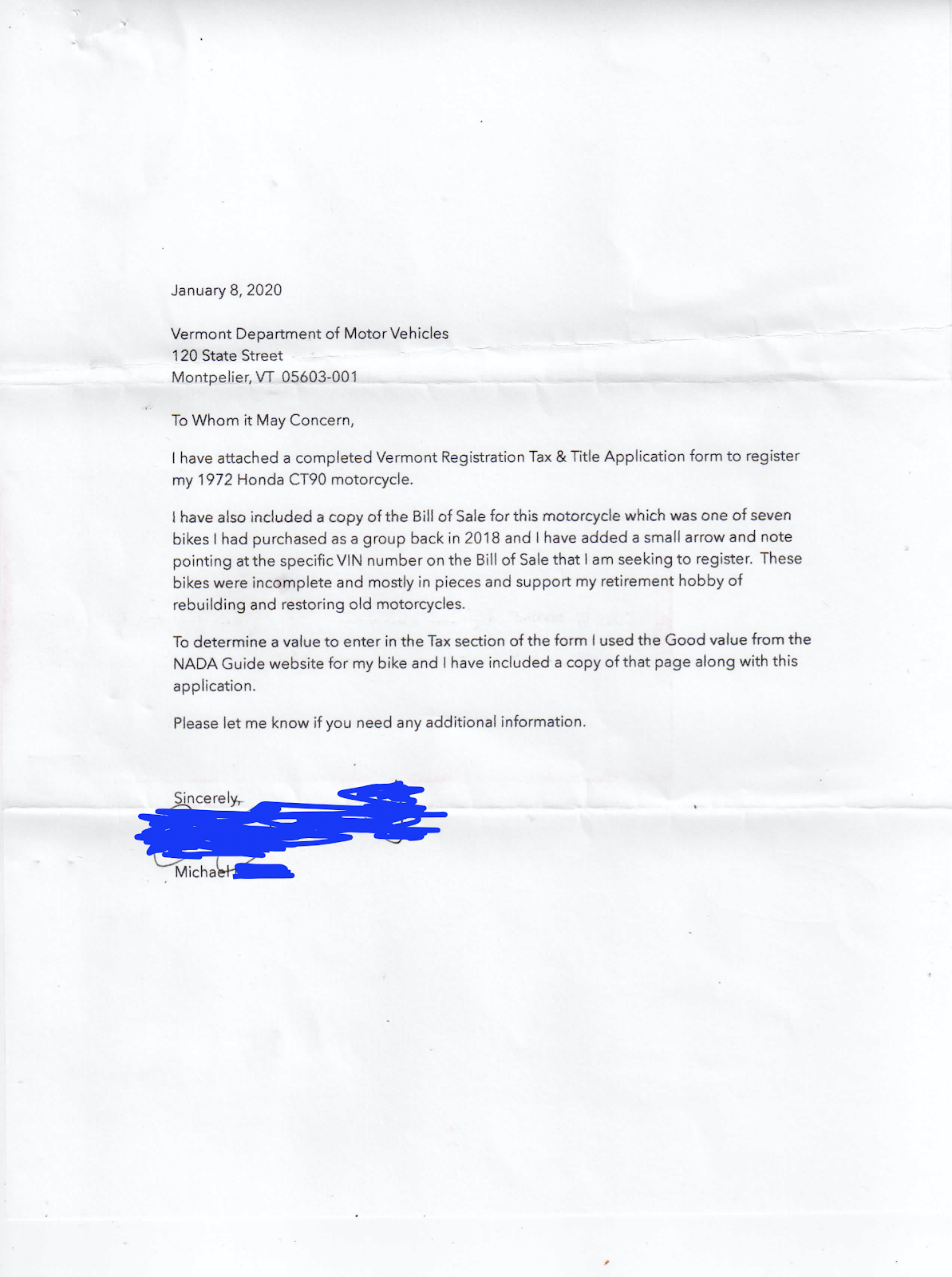 To apply for a registration of a small motorcycle like a Honda CT90 in Vermont you need the following: