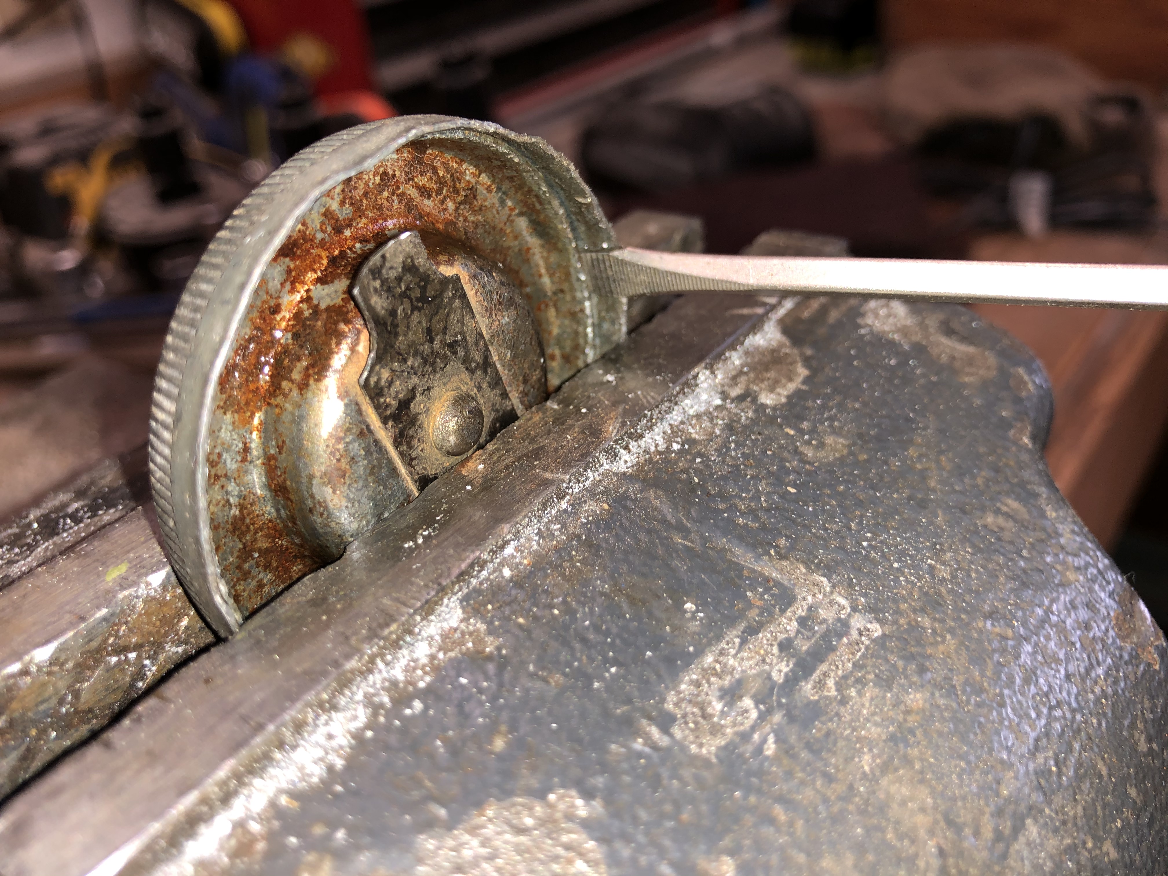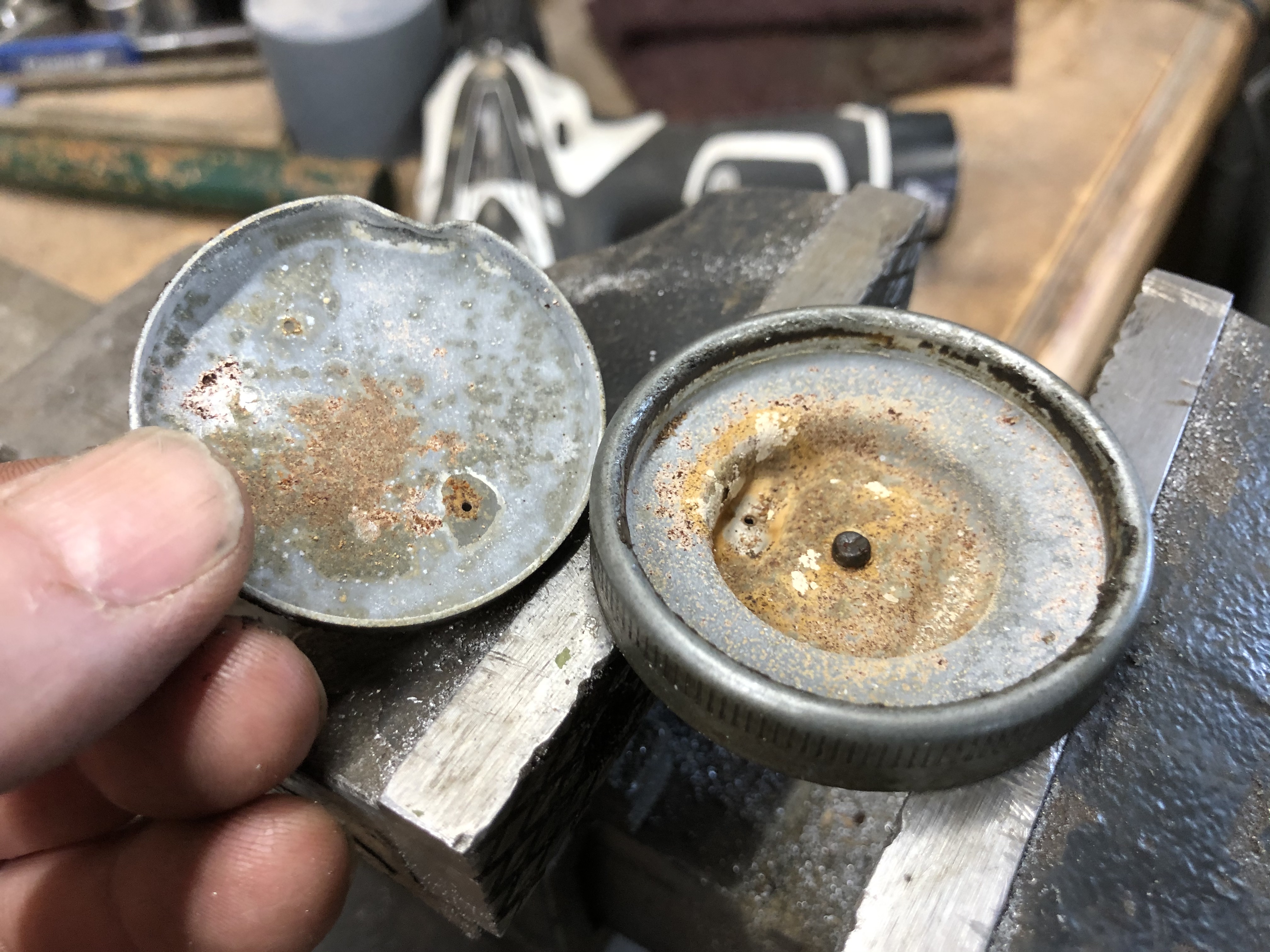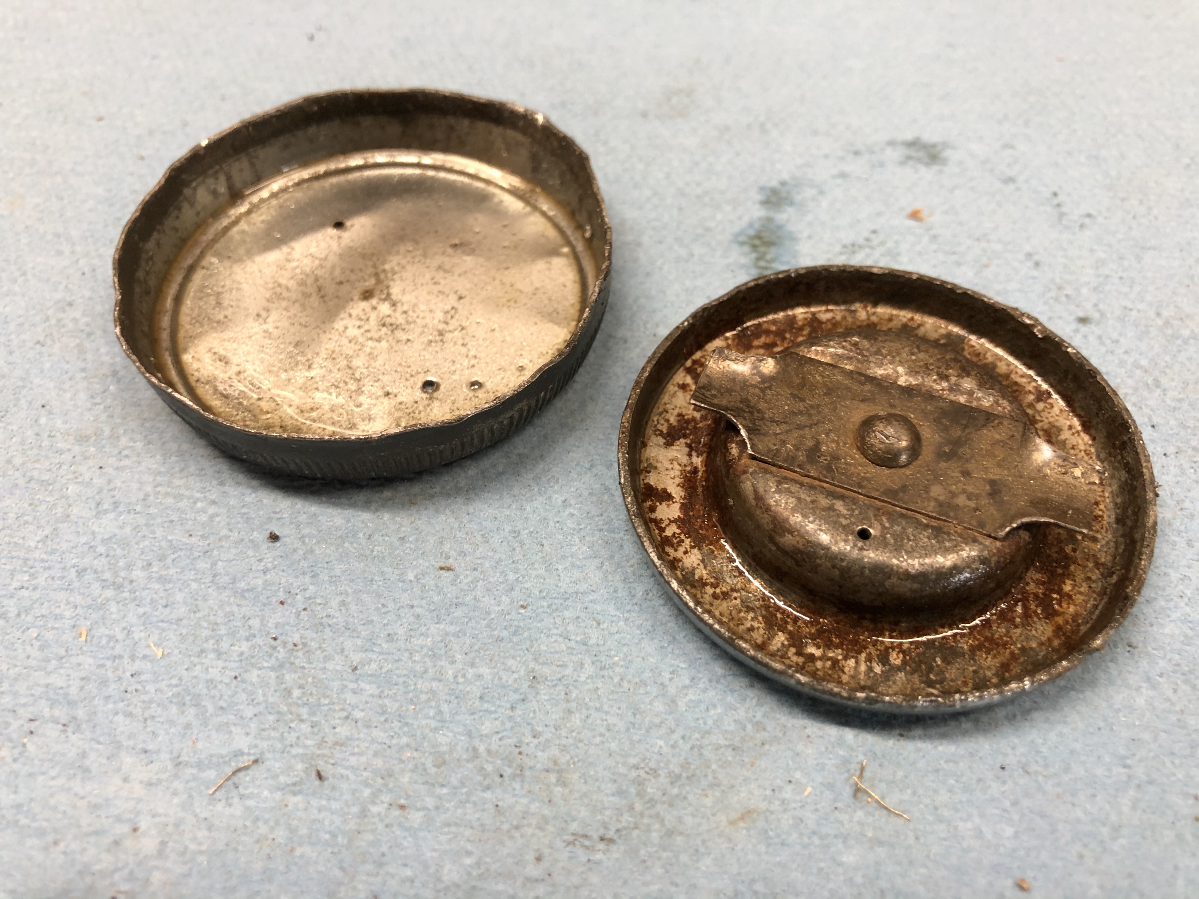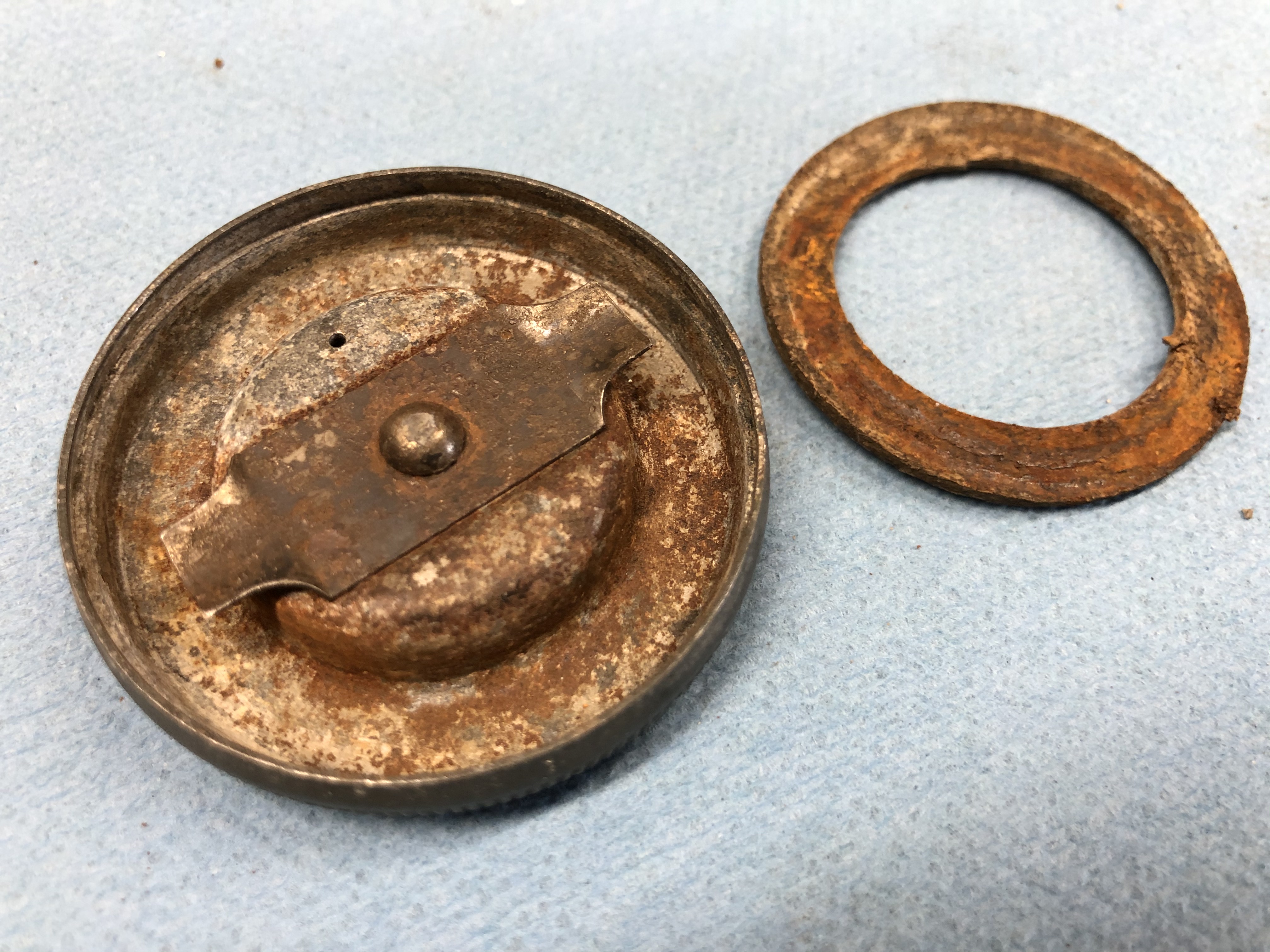 With the cap disassembled it is now easy to clean up both parts to get rid of all the rust and crud that can clog the vent holes. To reassemble the gas cap you just need to straighten out the rim of the cap you pried out of the main cap and then tap it back in place.